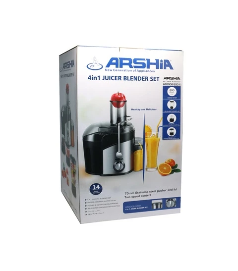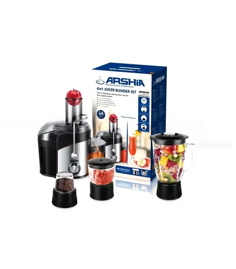 Prepare fresh juices, smoothies, and blends easily with the Arshia 4-in-1 Juicer Blender 800W (AS2006-5501). Designed with a powerful 800W motor, it delivers efficient blending, grinding, and juicing for everyday kitchen use.