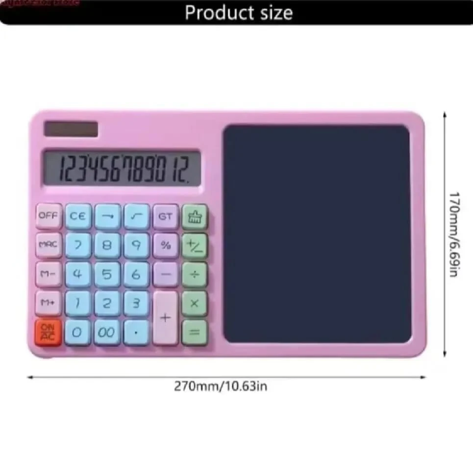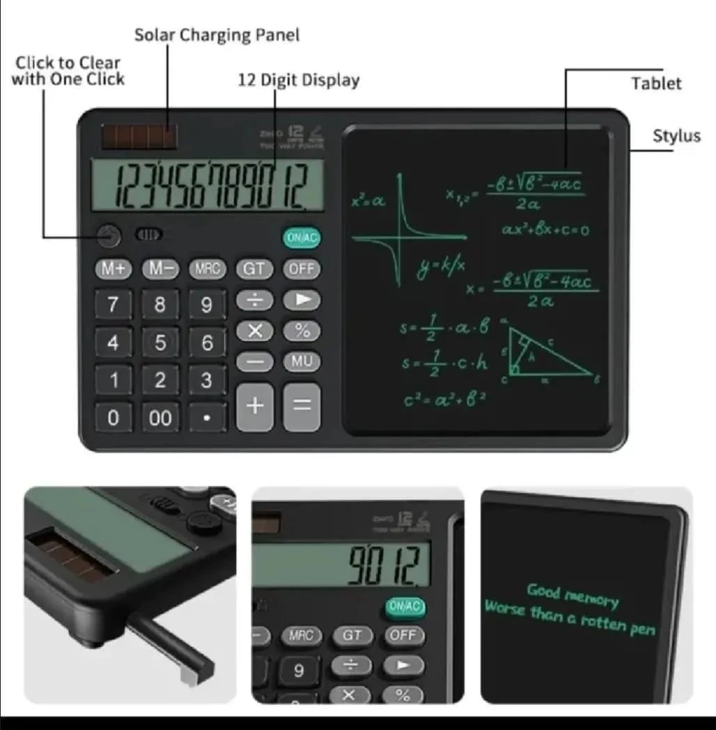 Product Description: Calculator and writing pad in one device Write, draw, and erase instantly with one button Saves paper and helps reduce waste Lightweight and easy to carry anywhere Ideal for math solving, notes, and quick calculations Protects your important notes from accidental deletio