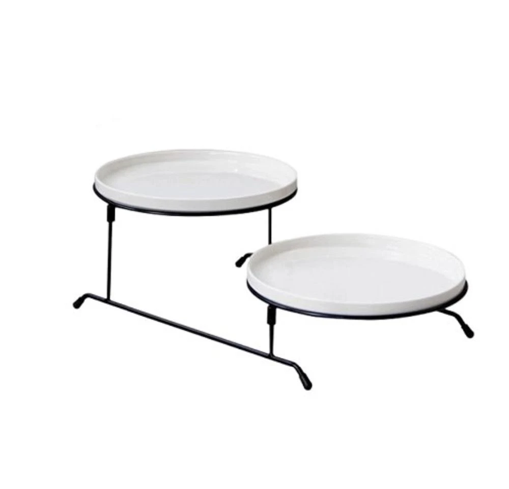 Crafted from high-quality ceramic, these trays are durable enough to handle daily use without chipping or cracking. The black metal stand is sturdy and lightweight, making it easy to move around while keeping your serving items elevated and organized. The smooth, glossy surface is not only visually appealing but also resistant to stains and heat, making it a smart choice for busy kitchens and festive occasions.