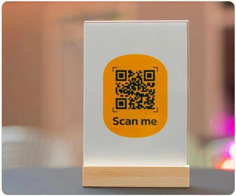 6 x 8 Inches QR Code Acrylic Sign Brochure Holder and Menu Stand with Wooden Base A clean and modern display featuring a transparent acrylic stand placed on a wooden base. In the center of the stand, there is a bright yellow label with a black QR code and the text “Scan me” written below it.