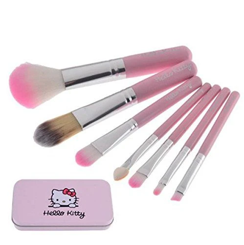 • This is a brand new set of super cute Hello Kitty makeup brushes It includes 7 handy pink brushes, in a Hello Kitty metallic hard case!